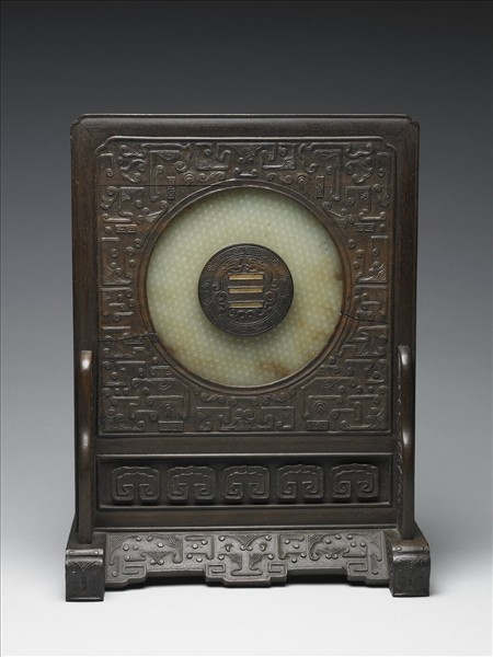 白玉,玉質瑩潤,局部帶褐色沁,有璺。內外邊緣各刻圈紋一道,兩面滿佈蒲紋。此環嵌於乾隆雕花紫檀插屏木座正中,置玉璧孔處有一圓形固定木,上陰刻「☰」(乾)卦及雙龍紋,隱含「乾隆」之意,亦示乾隆敬天,受命于夫,承天啟運之意。