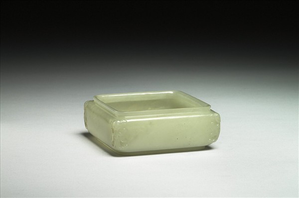 白玉,玉色泛黃有綹,帶灰斑。器作方形,有圈足。器身四角浮雕四獸。