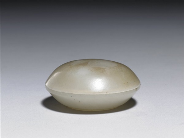 白玉,有赭沁,帶灰斑點。蓋與器身略相等,弧形壁,有圈足。