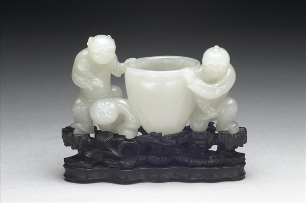 白玉質,杯作成缸形,有一童子蹲於左方,右方有一童子側臥於缸旁,另一童子持杓立於一旁,三人髮型、衣飾各有不同,表情生動活潑。附鏤空湖石木座一只。
