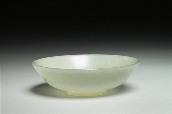 白玉,原似為碗蓋。弧形壁,稍垂腹,有圈足。樸素無紋。