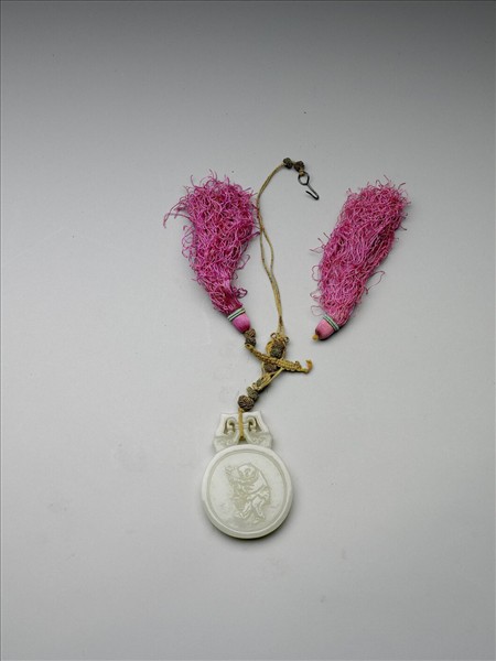 白玉圓形玉佩,為十五件一組的十二生肖玉佩組之一,可共組成一圓形。此件一面雕篆書「寅」字,一面為虎首人身像,右手持靈芝,左手提籃。有鏤空鈕、帶絲穗。