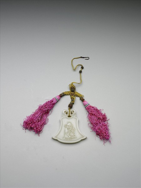 白玉斧形玉佩,為十二生肖玉佩組之一部份(共15件),可共組成一圓形。玉佩一面雕篆書「酉」字,一面為雞首人身像,雙手捧太極。有鏤空鈕、帶絲穗。