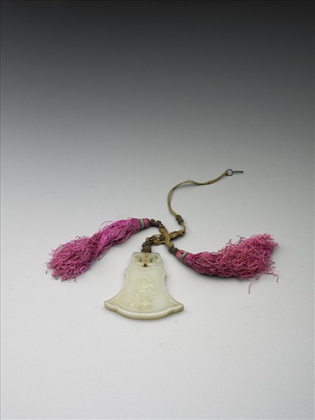 白玉斧形玉佩,為十二生肖玉佩組之一部份(共15件),可共組成一圓形。玉佩一面雕篆書「己」字,一面為蛇首人身像,口吐舌,雙手作揖。有鏤空鈕、帶絲穗。