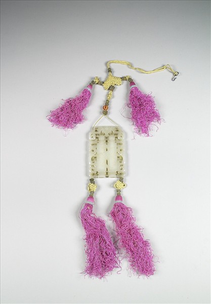 白玉。器呈方形片狀,主要紋飾為直筒狀雙連瓶,旁有鏤雕鳥獸紋環繞,瓶身上浮雕有鳥獸紋。側邊的鳥獸紋鏤雕有通心孔,使線繩得以穿過,連結瓶身與瓶蓋由兩片分開的玉片,精巧的設計使玉佩上的裝飾瓶蓋得以打開。帶中國結及絲穗。