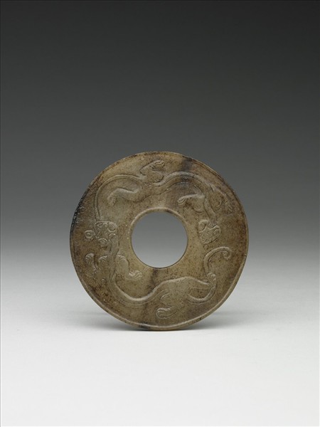 白玉,深色沁,並帶黑斑。一面淺浮雕雙獸紋;一面則雕如意雲紋。