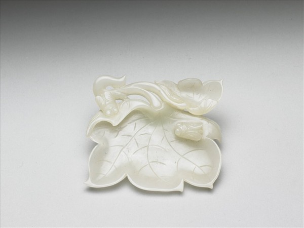 白玉質,琢成大小兩葉,大葉為主,小葉柄向右伸展至大葉右上方,作小碟狀。左上方葉柄及大葉右側各有一隻蟬,器面雕出枝葉葉脈等線條。附鏤空花葉木座一只。