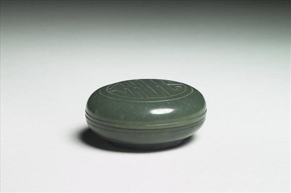 碧玉,有綹。蓋與器身略相等,弧形壁,有圈足。蓋面浮雕一團壽字。