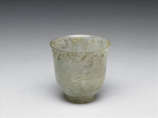 灰玉,口沿部分帶黃斑。敞口,直壁,圈足,杯壁略薄,圈足略厚,足內凸起。全器光素無紋,簡單素雅。