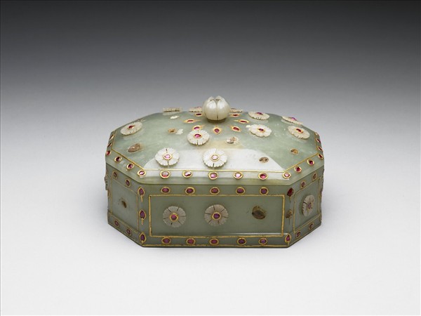 青玉琢作長方八角形盒。圓拱形蓋面及盒身周圍均貼白玉雕琢的石竹花朵,每朵花的花心,以及蓋面周緣、盒身周圍都以金絲鑲嵌紅玻璃。部分鑲嵌已脫落。蓋鈕雕作蓓蕾形。