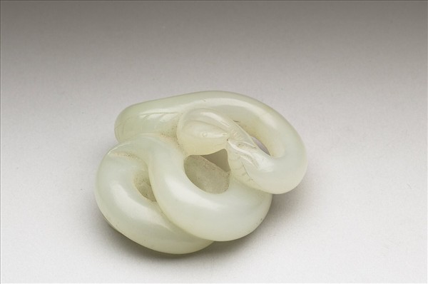 青玉。器作纏卷肖蛇形態,口吐分岔舌信,雕工精巧,唯妙唯肖。