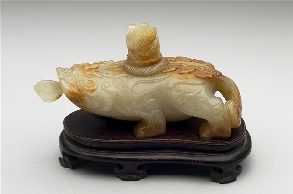 矮腿辟邪銜耳杯,器背一孔插一栓,栓頭雕飾鳩。器身飾以平浮雕飛雲紋,局部表面處理成褐紅色。此器裝飾手法仿自同時期的錯金銀銅辟邪。附木座。辟邪是漢、六朝流行的祥瑞動物,明清文人喜仿之,以銅或玉做成硯滴置於案頭。