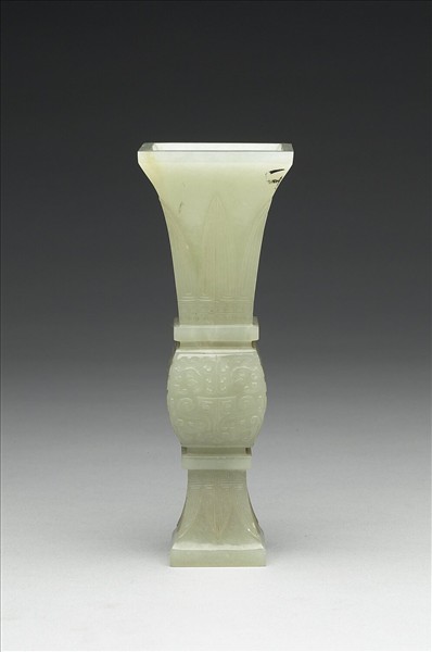 青玉。仿銅器觚形,器分三段,上、下段飾蕉葉紋,中段飾簡化獸面紋。