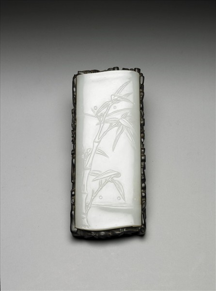 玉質,白色。長方形臂擱,左右兩側內捲,作竹片剖成一截的形狀。正面琢竹,圖像極富畫意。背面刻「虛其心,實其節,貫四時而不改柯易葉,以比君子之德。子昂。松雪。」詩文以竹比喻君子之德行,下接「子昂」、「松雪」兩印,「子昂」和「松雪」為趙孟頫的字號。附鏤雕木座。
