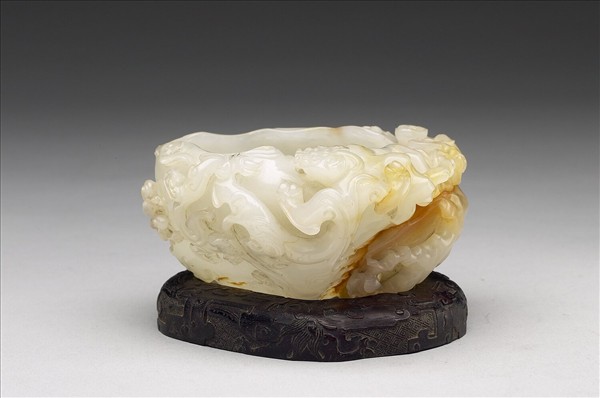 白玉,帶濃淡不一的赭黃色斑及瑕紋。器外浮雕老幹梅花及子母螭龍。底刻篆書四字「喜占春魁」。此器附清宮舊作木座。