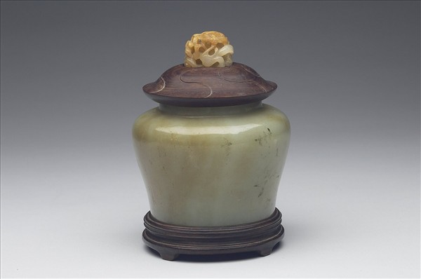 青玉,帶淺赭斑。罐形,直口,豐肩,弧壁,帶木蓋玉頂,附木座。器身光素無紋,木蓋雕葵形紋,白玉頂為元至明初作品。