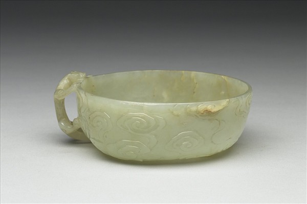 青玉,帶瑕。圓形平底,壁略淺。把手雕作獸,器身器底琢滿雲紋,一隻蝙蝠飛翔其中。