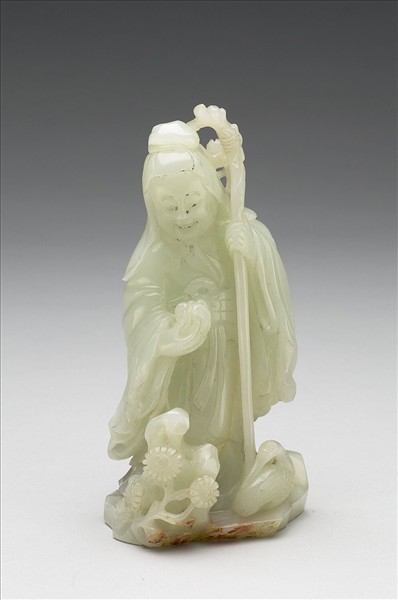 白玉,底部有赭黃斑背帶一長褐黃瑕斑。圓雕一長者,左手拄杖,杖頂掛菊花,右手捧佛手,跟前有湖石菊花和仙鶴,似象徵晉高士陶淵明為愛菊及喜愛閒雲野鶴為生活。