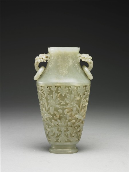 青玉,琢一扁瓶。頸部淺浮雕莨苕葉紋。雙柄雕作向上盛開的花朵,花莖還懸有活環。腹壁上高浮雕各式番蓮紋。