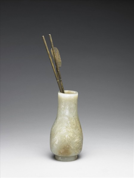 青玉,器身有瑕有璺,帶灰白赭黃色斑。直口,頸長體微碩,圈足。器壁琢花卉和靈芝。此瓶用以插置夾香品的香筷及剷平香灰的香鏟,三件組成一套,為清代宮廷常見的香具。