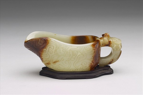 匜形,螭把,矮圈足。環器琢刻螭紋、雲紋,雕法似明晚期雕漆上的壽山福海花紋的雕法。白玉質地細膩,局部上藥料作成褐紅色,是模仿古玉局部受沁狀況。此器整體設計有濃厚的晚明特色,執持時的順手性即是其中之一,裝飾題材的融合漢風和當代風尚,亦屬其中之二。