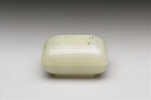 白玉。圓角長方形,方形圈足,器胎略厚。蓋頂琢一方框,內飾番蓮紋。