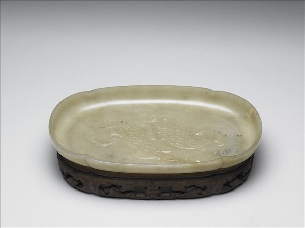 灰玉,帶黃黑沁斑。盤淺,作四瓣海棠花式,盤心淺浮雕雙鯉魚,生動流暢。此盤附木座,木座亦作海棠花式,面部鏤雕龍紋,帶「乙」字描金刻紋。