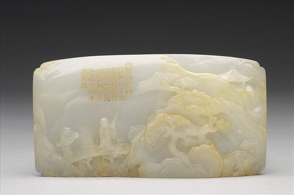 白玉質,薄留玉皮。一面平直;一面鼓凸略帶弧度,似裁切後之餘料。一面浮雕山水人物:盤陀策杖,童子攜琴。留白處陰刻填金隸書乾隆題畫詩:「御製松陰圖 盤陀松下坐聽濤,箕踞科頭逸興豪。攜得焦桐何必鼓,高山流水自然操。」詩錄於《清高宗御製詩文全集‧御製詩二集》卷34頁17,〈題張宗蒼松陰高士圖〉壬申(乾隆十七年,1752)。另面,梅枝橫出於山壁之間。留白處陰刻填金隸書乾隆題畫詩:「御製梅花詩 宋元合卷成三友,曾讀親書小令來。姑射今朝真覿面,連林鄧尉不妨開。」詩錄於《清高宗御製詩文全集‧御製詩二集》卷13頁13,〈題楊補之梅花〉己巳(乾隆十四年,1749)。