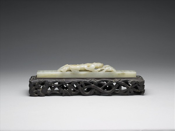 青玉,帶黑色、黃色沁斑。器作長方形,作鎮紙之用。上部琢雲紋,並浮雕子母獸,基底四面琢回紋。此件附木座,刻松竹梅鏤空紋飾。