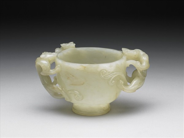 白玉,帶淺赭沁斑。杯有圈足,外壁浮雕三隻螭龍,螭首均攀倚杯口作飲水狀。「三螭」諧音「三喜」,具吉祥寓意。