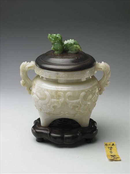白玉,有赭斑。鬲形爐,束頸、圓腹、袋形足。環耳作立雕龍形,龍嘴銜於爐口。口沿處飾虺紋與圓渦紋,腹部淺浮雕夔龍紋,以雷紋為地。器底有四字篆文印款:「子孫保之」。帶木蓋及木座,木蓋上有碧玉頂,為抬首異獸立雕,木蓋內有陰刻描金「乙」字。有黃籤:「東二右。伍十號。養。」