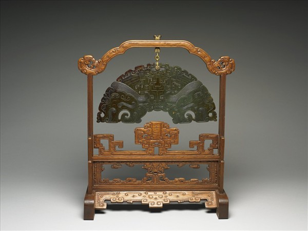 碧玉,色草綠,部分有深淺不一褐色。半圓弧形片狀,兩面紋飾相同,中央鏤雕以雲紋、回紋構成的抽象獸面,上方淺浮雕一具象之獸面,眉心處穿扣銅鉤,供懸掛用。兩端琢側面龍首,有長鬚髮,短角,捲鼻琢為鳳首,配有雕龍鳳紋的木架。