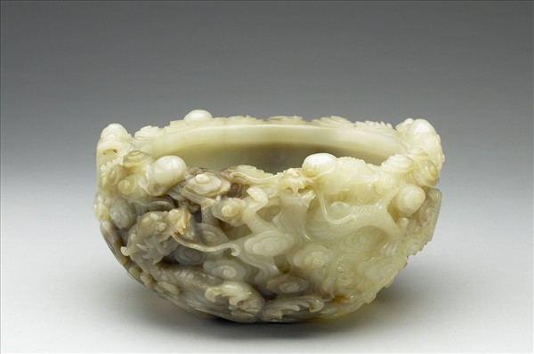 玉質。全器呈半球體,斂口、圓底。腹飾浮雕雲龍紋,底飾波濤紋,雕琢精巧細緻。