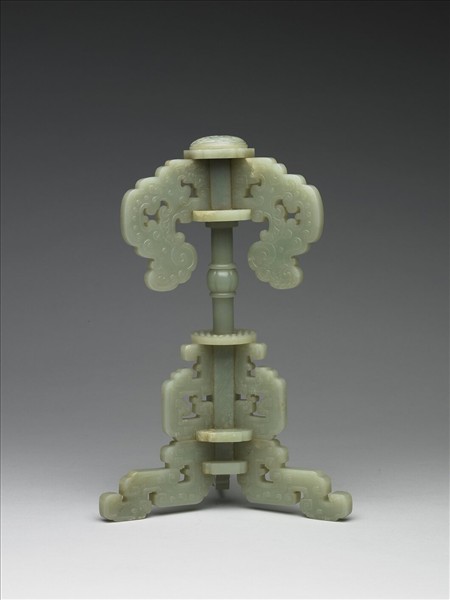 玉質。全器屬拆卸組合器,分為架、柱、座三部分,架、座為片狀變形夔龍構成。