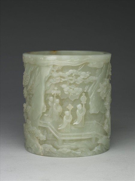 青玉質,光澤瑩潤。器外壁浮雕園林景物,九人行走其間。一人捧壽,其它手執「八吉祥」:輪、螺、傘、蓋、蓮、魚、寶瓶、盤長。器底飾水波紋。