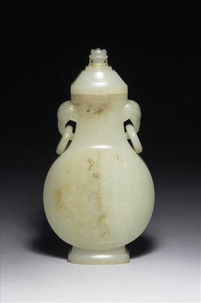 玉質。扁瓶,附方蓋、侈口、縮頸、象首環耳、扁圓腹、圈足。蓋、口、足沿均飾回紋,腹外圍回紋一圈,內飾「壽」字。外底心刻「乾隆年製」款。