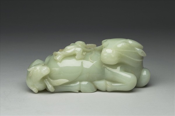 玉質。全器立雕子母牛,母牛伏臥回首,背上馱童子,手持枝葉,尾隨子牛,子牛亦伏臥,與母牛相望。