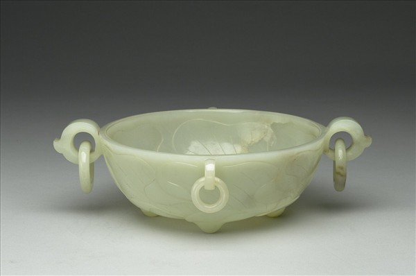 玉質。全器作半球體,側出四環耳,四足。腹內、外均由底心雕琢朵花展開狀。