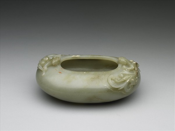 玉質。斂口、鼓腹、圓底,口飾弦紋,腹飾浮雕雙螭。