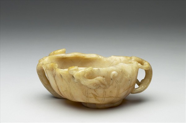 玉質。全器以荷葉帶柄為造型,荷葉上揚內卷作為器腹,口緣飾以高浮雕三螭攀緣其上。