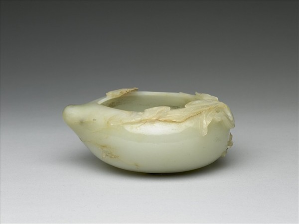 玉質。全器以桃實為造型,口緣琢以枝葉以及蝙蝠作為點綴。