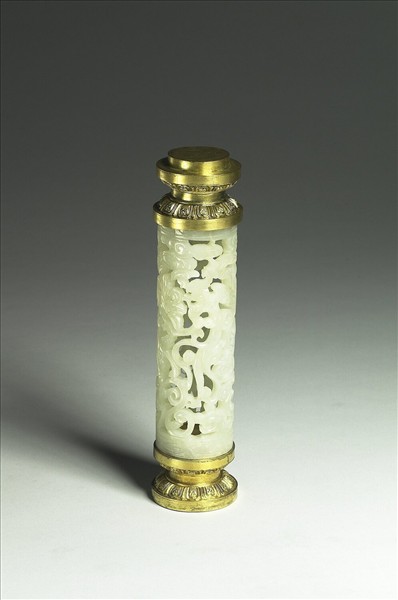 器呈直筒形,口緣及底邊為捲雲紋,外壁飾透雕之穿花龍、穿花鳳及螭紋。依其風格當為晚明的作品。其上下有鎏金的銅座及銅蓋。銅座、銅蓋部分為清代配製。