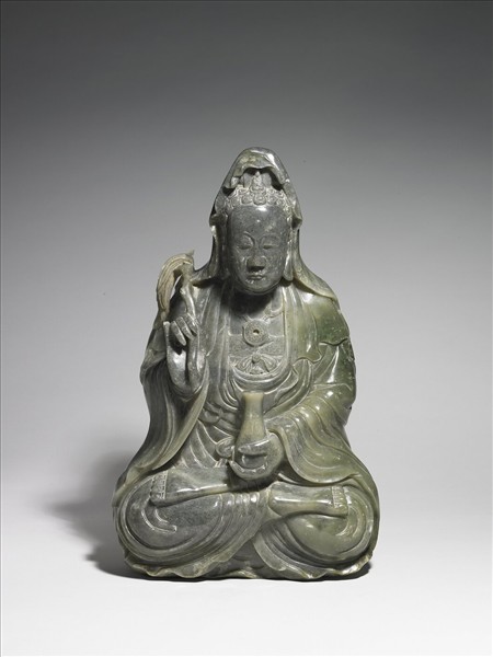灰玉立雕觀音,觀音盤膝而坐,左手持淨水瓶,右手執柳枝,神態肅穆。