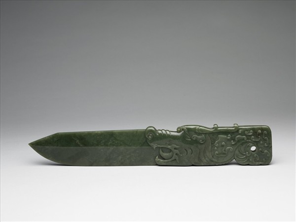 碧玉帶墨綠首刀,器如戈形,一邊刃,另一邊鈍形,柄作龍首張口狀,口啣刀內。龍身浮雕雲紋,刀兩面各有脊一條,柄背尾端琢「乾隆年製」四字隸款。
