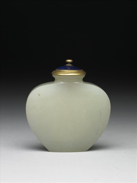 白玉,扁圓形,撇口,短頸,圓肩,斂腹,帶琺瑯銅蓋下木塞附銅匙。通體光滑,平素無紋。附葉紋桃形木座一只。