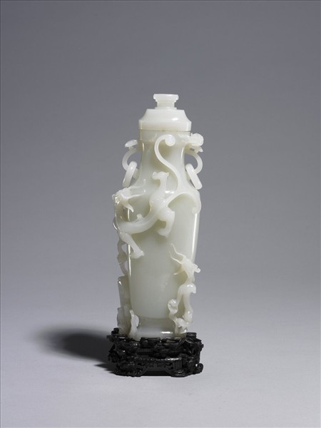 青玉。扁方瓶,有蓋,長頸,長腹,雙耳帶活環,高圈足。器身鏤雕兩隻龍首螭身獸,立於山石雲彩之上,其一口吐火珠,另雕飛舞蝙蝠二。器口琢「乾隆年製」隸款。附木座、錦袱、錦匣。