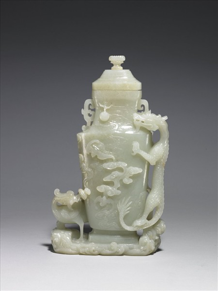 玉質,扁圓形尊,有蓋,雙耳。外有立雕龍及鳳,器表浮雕雲紋及蝙蝠,底作波濤紋。附錦袱。