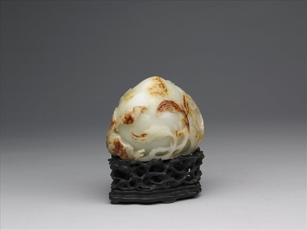 白玉帶黃赭斑。全器作桃形,巧雕蝙蝠及枝葉。附木座及錦袱,錦袱一面黃綾,另一面為菱形格錦。