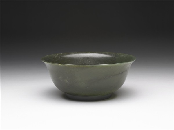 碧玉,色深綠。撇口、弧壁、圈足。平素無紋。外底心陰刻「大清乾隆年製」六字篆款。