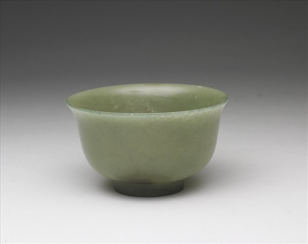 碧玉,色灰綠。撇口、弧壁、圈足。平素無紋。外底心陰刻「大清乾隆年製」六字篆款。